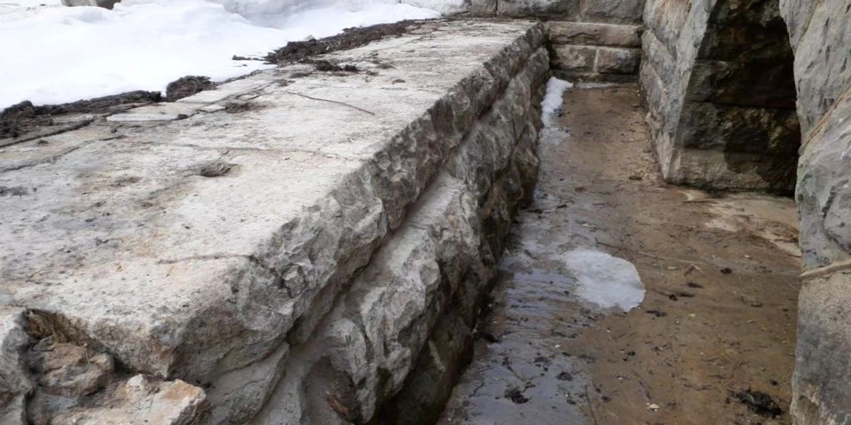 Prior to grouting, the contractor had to "point" (Pointing is the finishing of mortar joints in brick or stone masonry construction") all the large openings and seams in the stone. There were places that you could see right through to the water side. Further, this pointing sealed the area seen so the pressure grout would find the fissures within the spillway stone rather than blow back into the spillway.