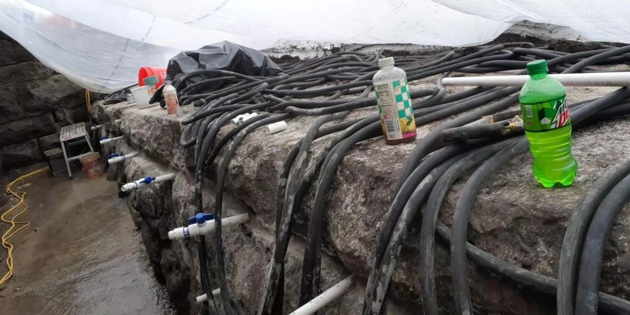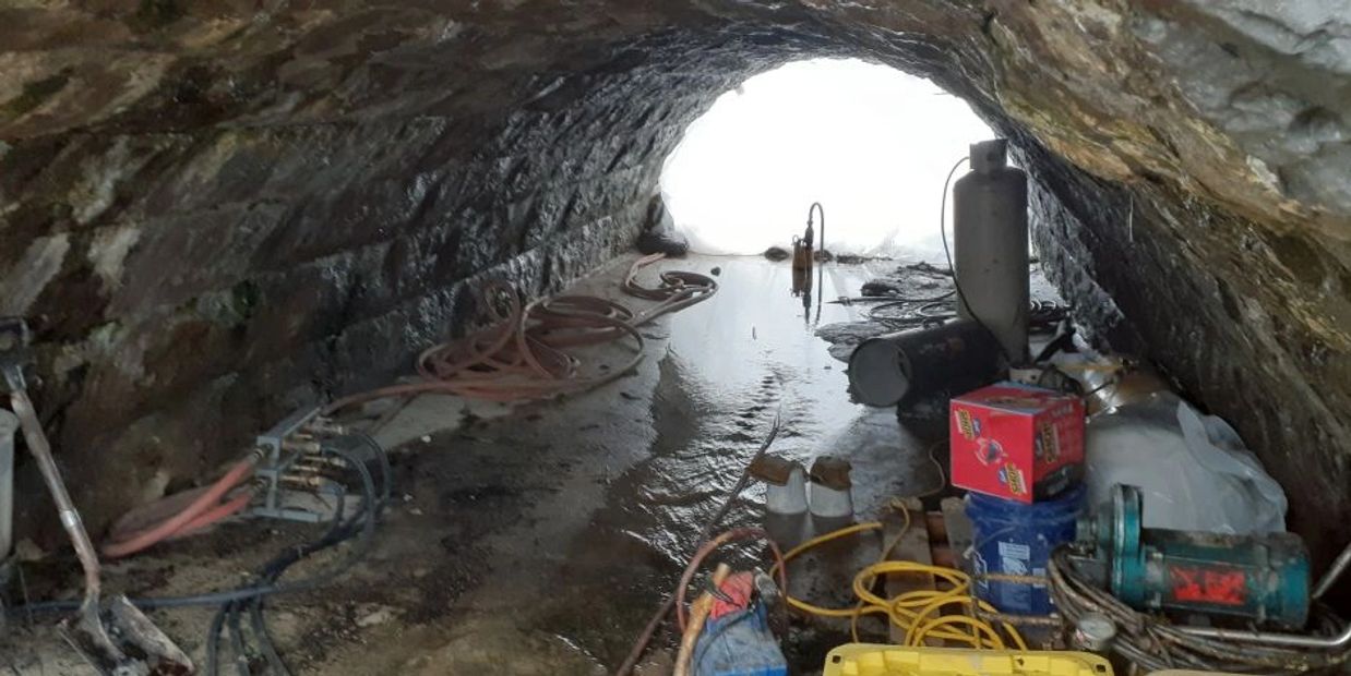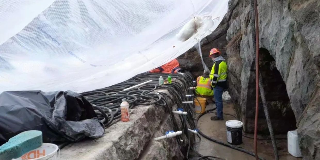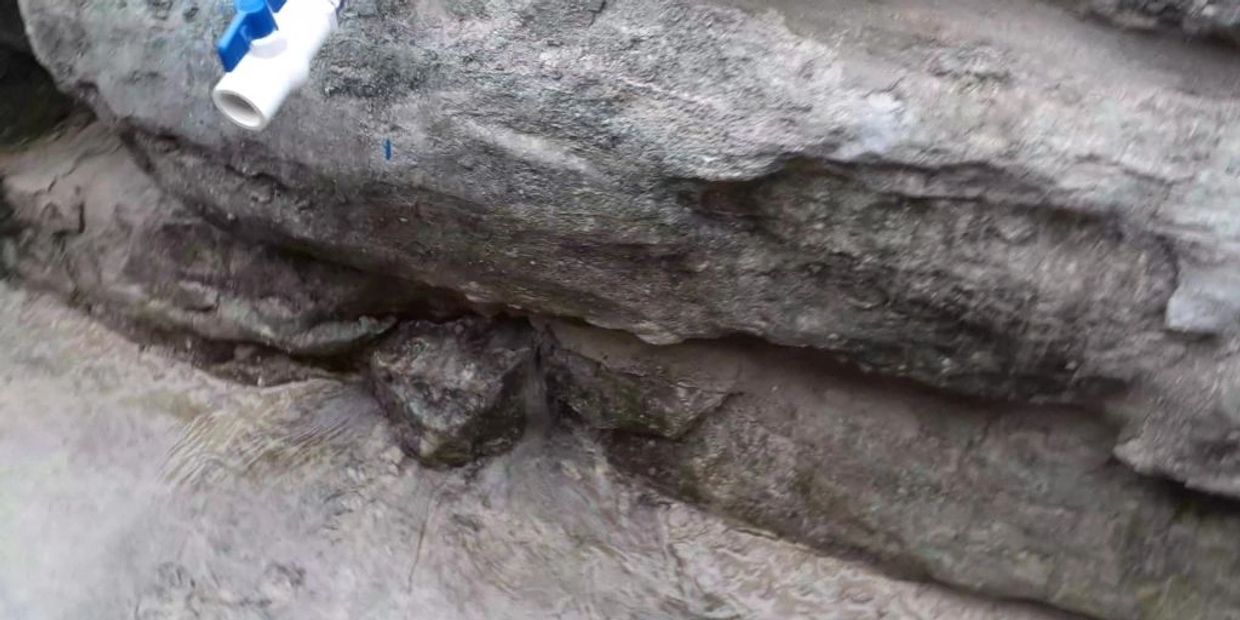 The white pvc pipes were installed in the openings for use to feed the pressure grout into the spillway using the blue valves to control the flow/volume of the grout. Once completed, these pvc pipes will be cut off and sealed.