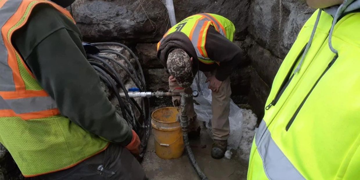 Close up of the base/floor leak. The Reservoir level came up about a foot from a few days of warmth and snow melt. There were several areas along the lower part of the spillway that were leaking. The pressure grout could not be used due to the running water and it would be washed out before curing. So a special foaming process was used for this issue.