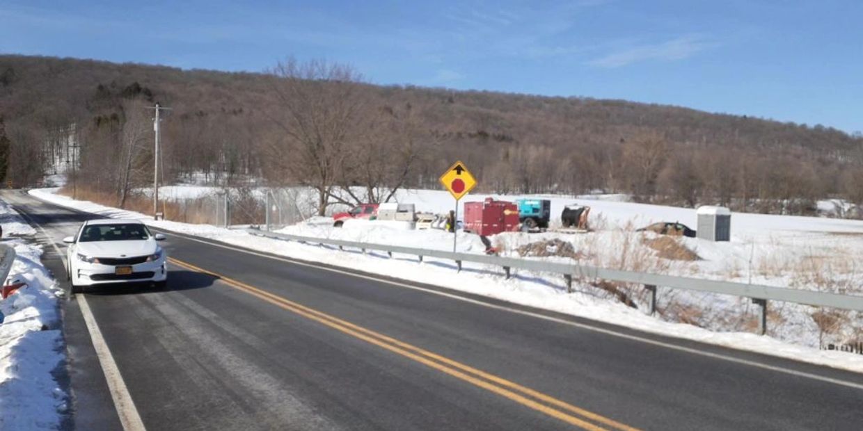 Looking West from Dam Road showing some of the equipment for the repair project staged in the parking area. The red piece of equipment is a heater that will circulate a glycol solution through many hoses run under the road and spread out on the spillway "hopper" (my term).