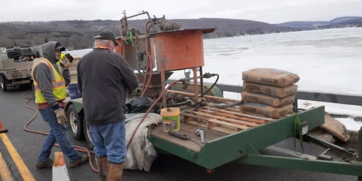 The equipment above on the road is a trailer that has the grouting mixer and pressure pump to fill the voids in the spillway.