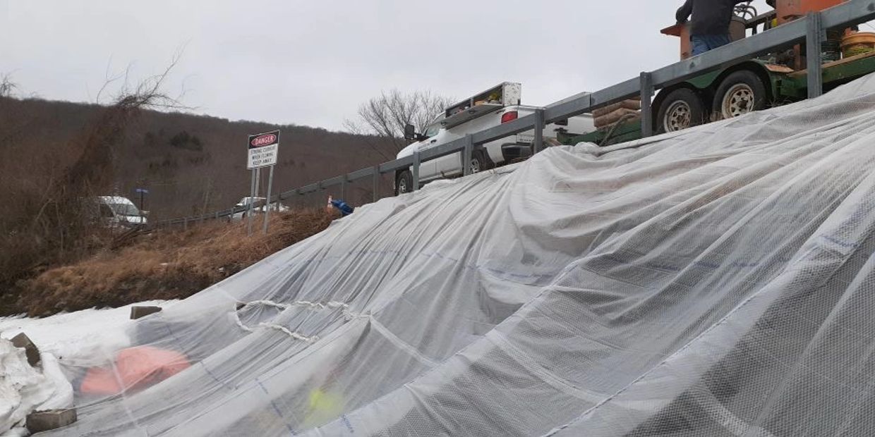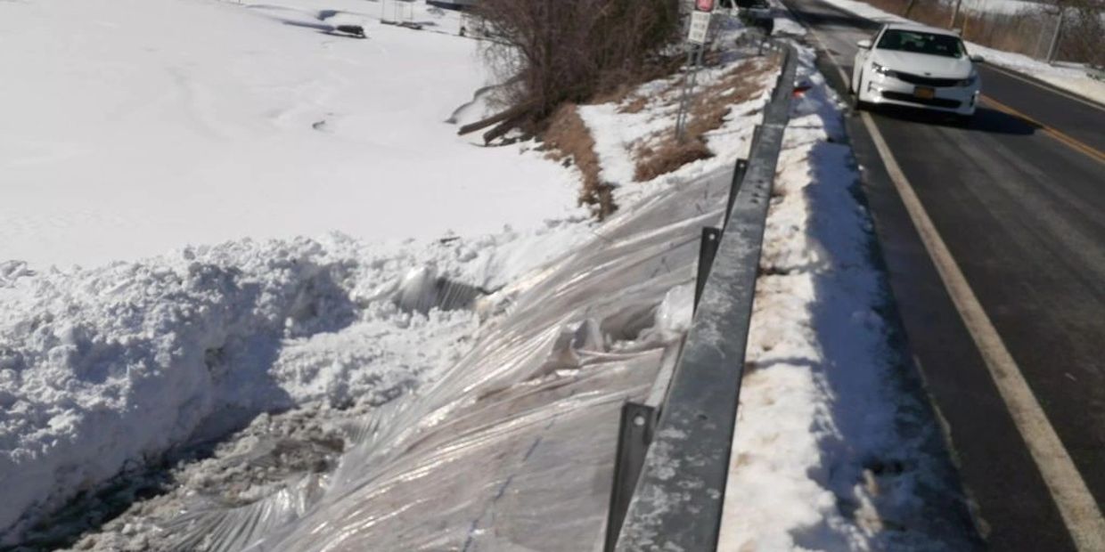 Tarp applied over the spillway on the Dam side to contain the heat being applied by circulating heated glycol through hoses run under Dam Rd.